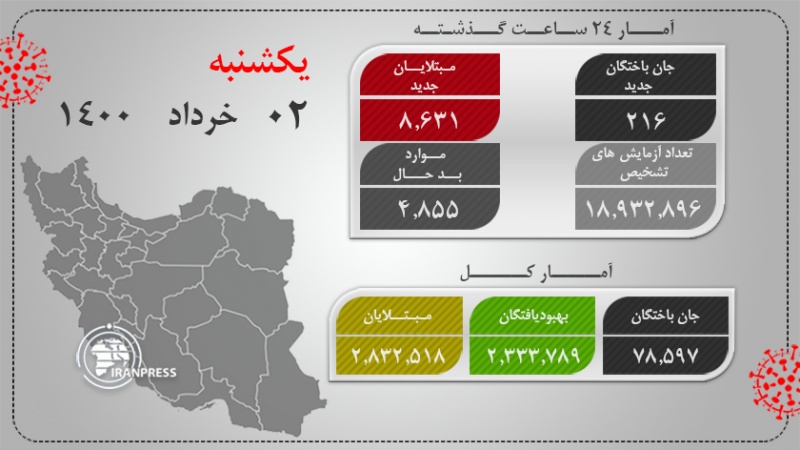 Иранның Денсаулық сақтау министрлігі бейсенбі күні: «Өткен 24 сағатта коронавирустан көз жұмған 216 адамды қосқанда елде жалпы құрбандар саны 78597 адамға жетті. Нақты диагностикалық көрсеткіштерге сәйкес, Иранда Covid-19 жұқтырған тағы 8631 адам анықталды. Жалпы індетке шалдыққандардың саны 2832518 адамға жетті»,- деп хабарлады.
