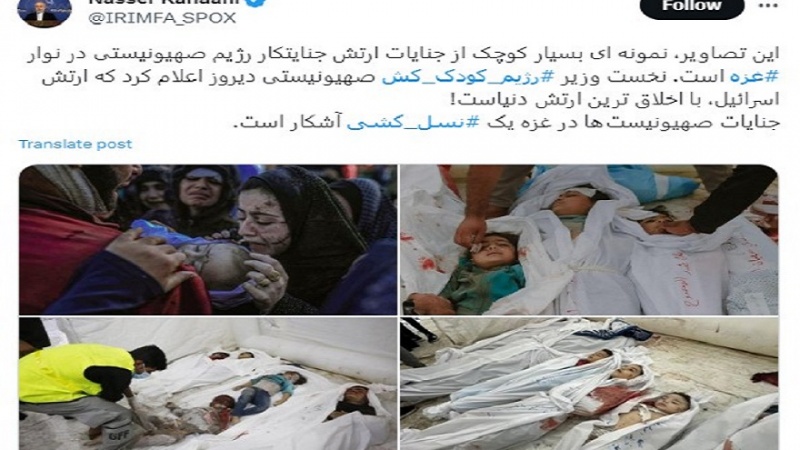 Иран Ислам Республикасы Сыртқы істер министрлігінің  баспасөз хатшысы Насер Канани Х әлеуметтік желісінде сионистердің Газаға жасаған шабуылдары кезінде шәһид болған балалардың суреттерін жариялап, былай деп жазды: "Бұл суреттер сионистік режимнің Газа секторындағы қылмыстық армиясының қылмыстарының өте шағын үлгісі болып табылады".
