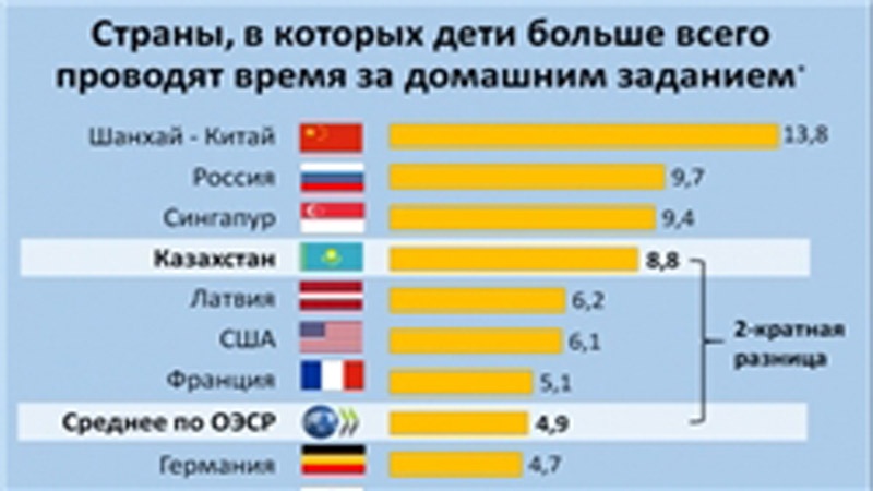 Мектеп оқушыларының үй тапсырмалары көлемінен 65 мемлекеттің ішінде Қазақстан әлемде 4-ші орында болса, Орталық Азияда 1-ші орынға ие.
