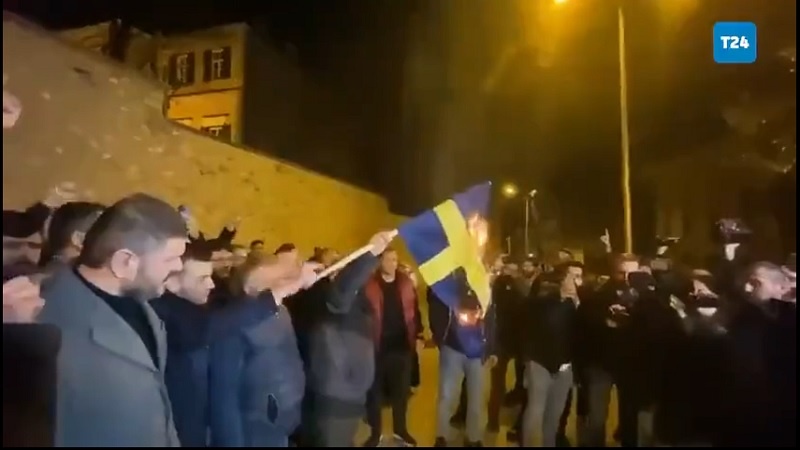 Полиция күштерінің қолдауымен экстремистік адамға Құранды өртеуге рұқсат бергеннен кейін ызаланған түрік халқы Анкарадағы елдің елшілігінің алдында Швеция туын өртеп жіберген.