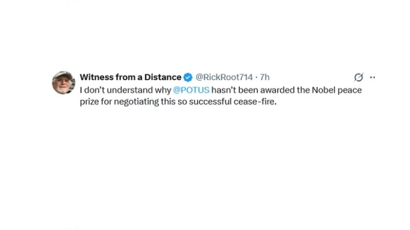 (атысты тоқтатудың сәтсіздігіне меңзеу) Мен неге @POTUS-қа (АҚШ президенті) осы өте сәтті атысты тоқтату туралы келіссөздер жүргізгені үшін Нобель бейбітшілік сыйлығы берілмегенін түсінбеймін.