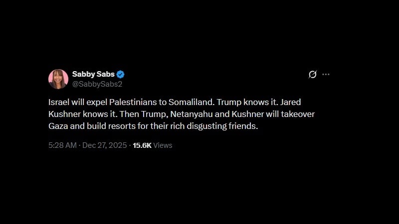 Кинорежиссер және БАҚ белсендісі  Саби Сабес  есімді тағы бір X пайдаланушысы былай деп жазды: «Израиль палестиналықтарды Сомалилендке депортациялайды. Трамп мұны біледі. Джаред Кушнер мұны біледі. Содан кейін Трамп, Нетаньяху және Кушнер Газаны басып алып, бай және жеккөрінішті достарына курорттар салады».