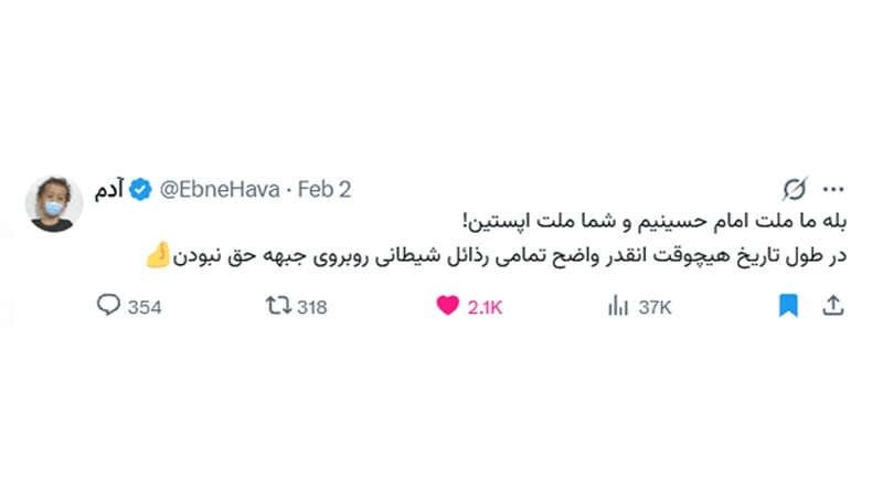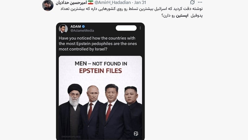 Эпштейн ісі мен Трамптың қорқытуларына реакция ретінде ирандық пайдаланушылар: «Біз Имам Хусейннің ұлтымыз, ал олар Эпштейннің ұлты», - деп жазды.