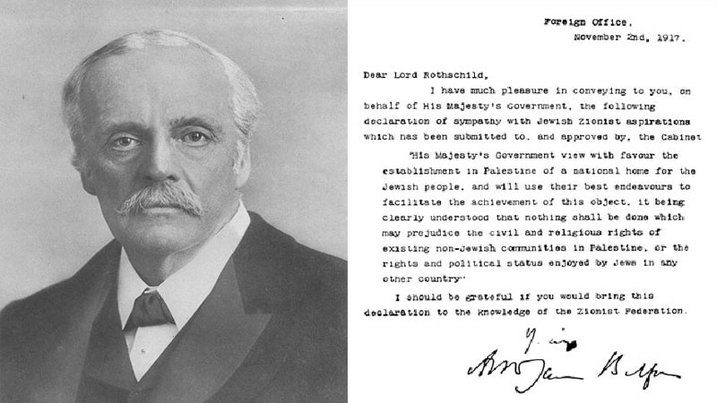 Осылайша Ұлыбританияның сол кездегі Сыртқы істер министрі Артур Бальфур 1917 жылы қарашаның екісі күні тарихта "Бальфур декларациясы" деген атпен танымал болған декларацияны жариялау арқылы Палестинада еврейлер үшін мемлекет құру идеясын қолдады. Ол кезеңде Палестина әлі Осман империясының отары саналатын.