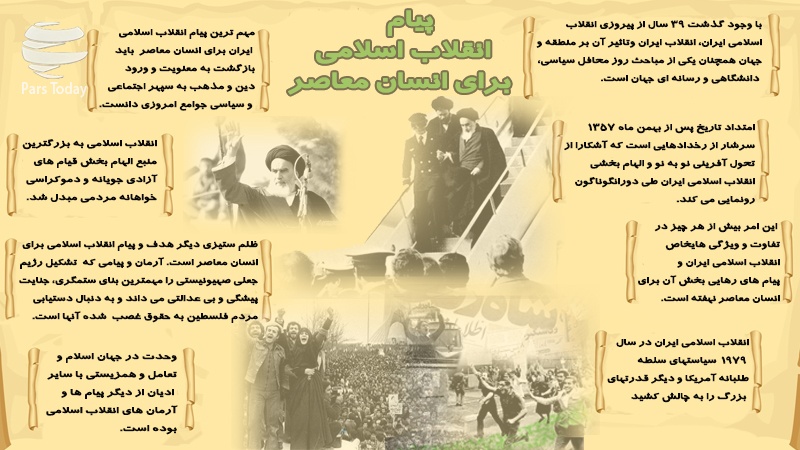 Ислам революциясының жеңісінен 39 жыл өткеніне қарамастан Иранда болған революция мен оның аймақ пен әлемге әсері әлі күнге дейін жаһанның саяси, университеттік және ақпараттық орталарында талқыланатын тақырыптардың бірі болып отыр. 1357 жылдың бахман айынан кейін тарихта көптеген оқиға орын алды. Әртүрлі кезеңдердегі мұндай оқиғалардан Иран Ислам революциясынан шабыт алған жаңа өзгерістерді айқын көруге болады. Бұның мәні бәрінен бұрын Иран Ислам  революциясының ерекшеліктері мен қазіргі заман адамына беретін құтқарылу жолдауларында жатыр. Иран Ислам революциясы 1979 жылы АҚШ пен басқа да ірі алпауыттардың үстемшіл саясаттарын түйткілге ұшыратып қана қойған жоқ, 40 жылға жуық уақыт бойы өз болмысын жалғастыру арқылы қазіргі заман адамы үшін жаңа тағылымдар мен армандарды ала келді. Уақыт өткен сайын бұл тағылымдар мен жолдаулар ескіріп, жоғалмағанымен қатар қазіргі заман адамы үшін оның тартымдылықтары арта түсуде.