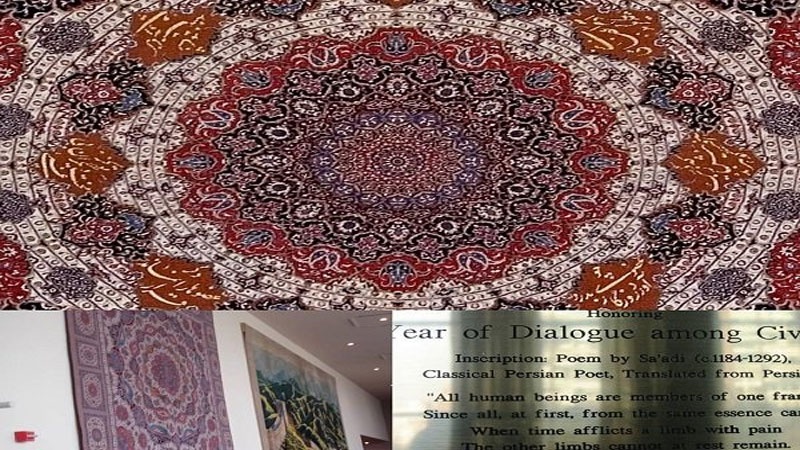 Сағдидің бұл өлеңі Ирандағы кілем тоқу өнерінің атақты шебері, исфахандық өнер иесі Мұхаммад Сирафианның қолымен өте нәзік парсы кілемінің ортасына саф алтынмен өріліп жазылған. 5х5 метрлік бұл кілем БҰҰ-ның ең жақсы жерлерінің бірінде, яғни дипломаттардың кездесулері мен келіссөздері өтетін жерде ілулі тұр. Осы өлең Иранның БҰҰ-дағы тұрақты өкілдігі тарапынан ағылшын тіліне аударылып, кілемнің жанына ілінген. Содан бері әрбір көрермен Иран мәдениеті мен өркениетіне, ирандықтардың даналығы мен хикметіне тамсанып келеді.