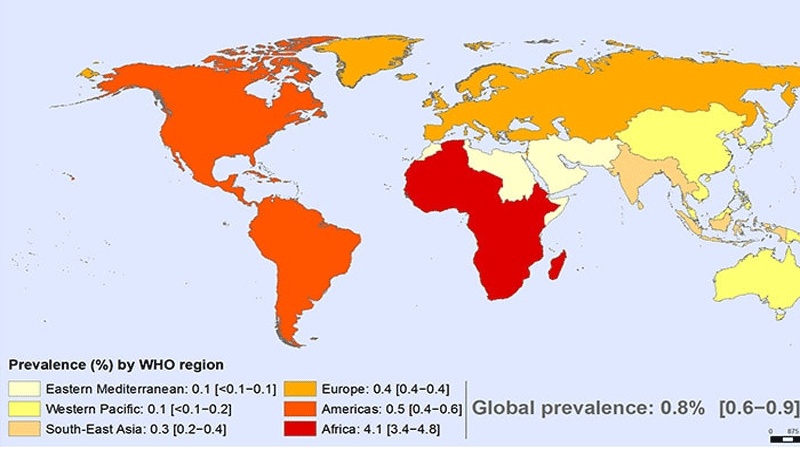 Дүниежүзілік Денсаулық ұйымының 2017 жылғы статистикасы бойынша 15-49 жастағы адамдар арасындағы HIV вирусы таралуының картасы
